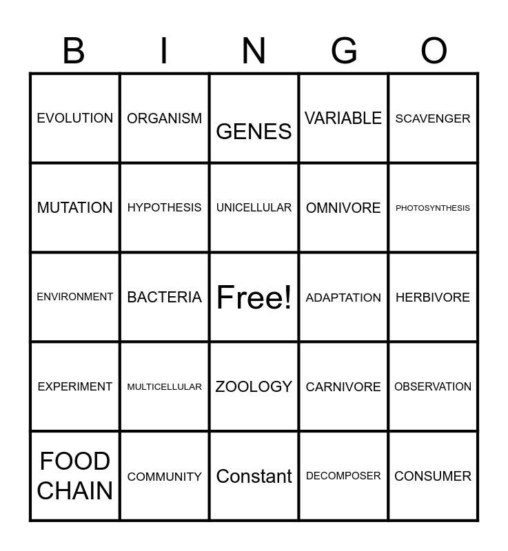 This bingo card has a free space and 39 words: DNA, THEORY, Energy, CARNIVORE, OBSERVATION, EXPERIMENT, BACTERIA, WATER, ADAPTATION, HERBIVORE, MUTATION, ORGANISM, NUCLEUS, PHOTOSYNTHESIS, ENVIRONMENT, MULTICELLULAR, ZOOLOGY, VARIABLE, VIRUS, FOOD CHAIN, HYPOTHESIS, UNICELLULAR, DECOMPOSER, SCAVENGER, RESPIRATION, COMMUNITY, Constant, ECOLOGY WATER, PREDATOR, EVOLUTION, CLASSIFICATION, CELL, OMNIVORE, CONSUMER, POPULATION, Protein, GENES, PRODUCER and Reproduction.