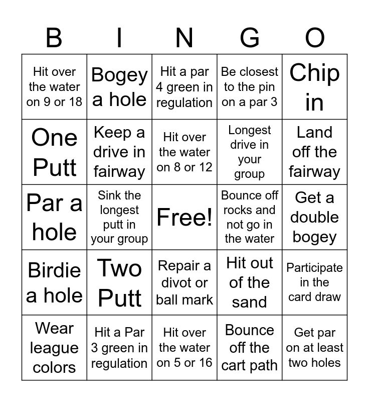 This bingo card has a free space and 24 words: Two Putt, Hit a Par 3 green in regulation, Hit over the water on 8 or 12, Wear league colors, Chip in, Hit over the water on 9 or 18, One Putt, Bogey a hole, Bounce off rocks and not go in the water, Repair a divot or ball mark, Longest drive in your group, Par a hole, Hit out of the sand, Participate in the card draw, Keep a drive in fairway, Bounce off the cart path, Get a double bogey, Hit a par 4 green in regulation, Land off the fairway, Sink the longest putt in your group, Get par on at least two holes, Birdie a hole, Be closest to the pin on a par 3 and Hit over the water on 5 or 16.