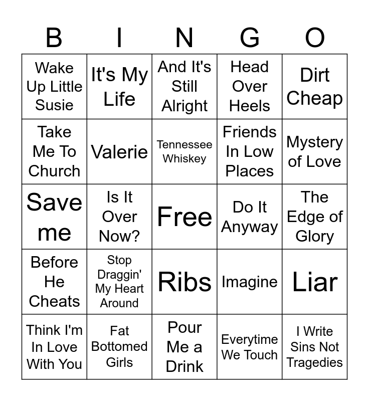 This bingo card has a free space and 24 words: Stop Draggin' My Heart Around, Fat Bottomed Girls, Tennessee Whiskey, Think I'm In Love With You, Dirt Cheap, Wake Up Little Susie, Take Me To Church, It's My Life, Do It Anyway, Ribs, Friends In Low Places, Save me, Imagine, Liar, Valerie, Everytime We Touch, The Edge of Glory, And It's Still Alright, Mystery of Love, Is It Over Now?, I Write Sins Not Tragedies, Before He Cheats, Head Over Heels and Pour Me a Drink.
