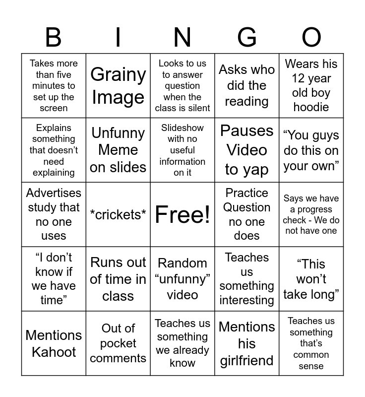 This bingo card has a free space and 34 words: Goes on a tangent, Mentions his girlfriend, Monty Python reference, Starts speaking another language, “I don’t know if we have time”, Unfunny Meme on slides, Wears his 12 year old boy hoodie, Mentions Kahoot, Grainy Image, Talks about that one time he lived in China, Slideshow with no useful information on it, Looks to us to answer question when the class is silent, Asks if anyone has travelled to xyz so he can brag about his trips, “I’ve actually been there”, Practice Question no one does, “You guys do this on your own”, Out of pocket comments, Advertises study that no one uses, Runs out of time in class, Teaches us something interesting, Random “unfunny” video, Forgets to give us document acsess, Takes more than five minutes to set up the screen, Says we have a progress check - We do not have one, Teaches us something we already know, Teaches us something that’s common sense, Asks who did the reading, Overcomplicates something simple, Pauses Video to yap, Explains something that doesn’t need explaining, Overestimates the time it takes to do something, *crickets*, “This won’t take long” and Zzzzz class falling asleep.