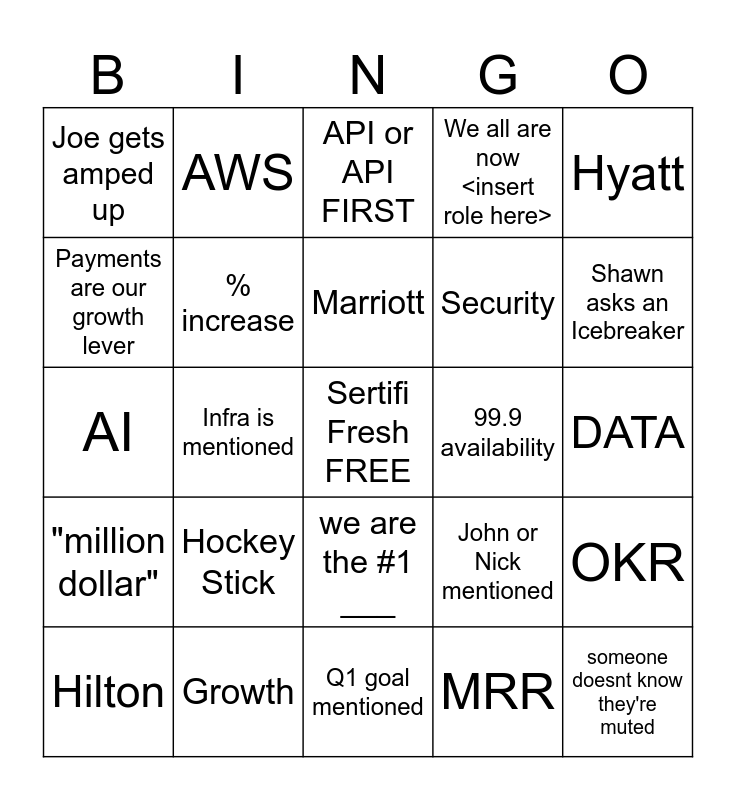 This bingo card has a free space and 24 words: Hockey Stick, Growth, Marriott, Hilton, Hyatt, Joe gets amped up, Payments are our growth lever, AWS, 99.9 availability, we are the #1 ___, Security, AI, John or Nick mentioned, OKR, % increase, MRR, DATA, API or API FIRST, Shawn asks an Icebreaker, Infra is mentioned, someone doesnt know they're muted, "million dollar", We all are now <insert role here> and Q1 goal mentioned.