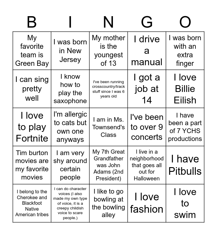 This bingo card has a free space and 24 words: I am very shy around certain people, I can do character voices (I also made my own type of voice, it is a creepy childish voice to scare people.), I've been running crosscountry/track stuff since I was 6 years old, I belong to the Cherokee and Blackfoot Native American tribes, I was born with an extra finger, My favorite team is Green Bay, I can sing pretty well, I was born in New Jersey, I've been to over 9 concerts, My 7th Great Grandfather was John Adams (2nd President), I got a job at 14, I love to play Fortnite, I live in a neighborhood that goes all out for Halloween, I have Pitbulls, I know how to play the saxophone, I love fashion, I have been a part of 7 YCHS productions, My mother is the youngest of 13, I love Billie Eilish, I'm allergic to cats but own one anyways, I love to swim, Tim burton movies are my favorite movies, I drive a manual and I like to go bowling at the bowling alley.