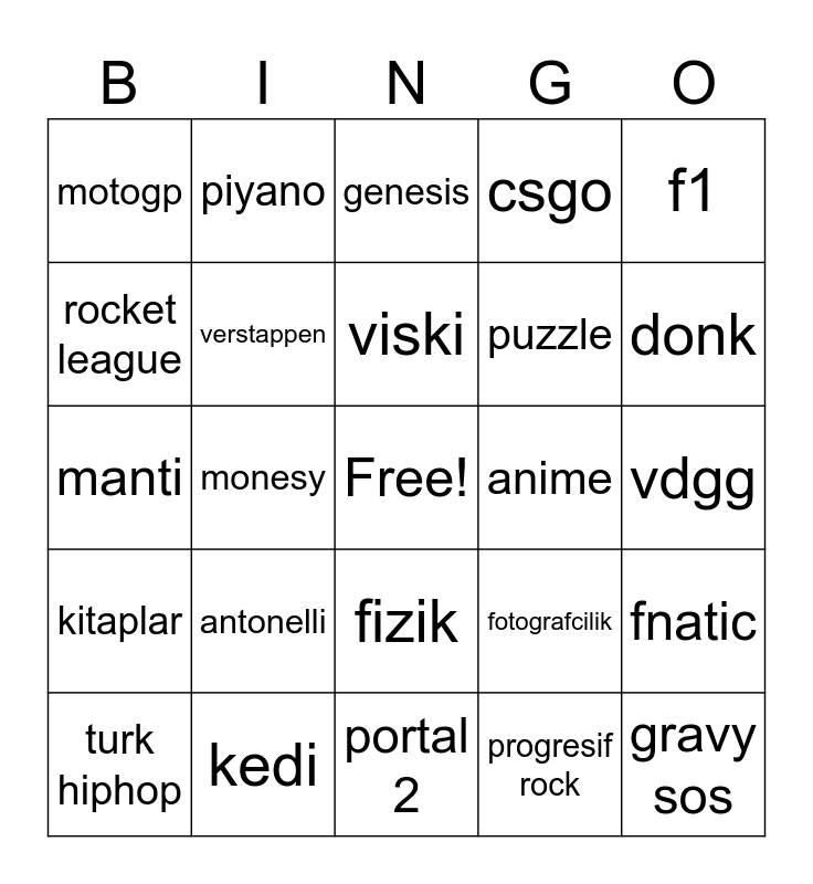 This bingo card has a free space and 24 words: antonelli, kedi, viski, turk hiphop, f1, motogp, rocket league, piyano, anime, fizik, puzzle, manti, fotografcilik, fnatic, verstappen, progresif rock, vdgg, genesis, donk, monesy, gravy sos, kitaplar, csgo and portal 2.