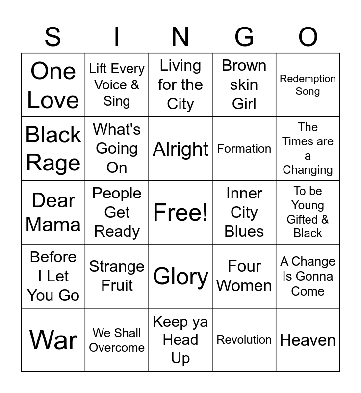 This bingo card has a free space and 24 words: Strange Fruit, We Shall Overcome, Alright, War, Redemption Song, One Love, Black Rage, Lift Every Voice & Sing, Inner City Blues, Glory, Formation, Dear Mama, Four Women, A Change Is Gonna Come, What's Going On, Revolution, To be Young Gifted & Black, Living for the City, The Times are a Changing, People Get Ready, Heaven, Before I Let You Go, Brown skin Girl and Keep ya Head Up.