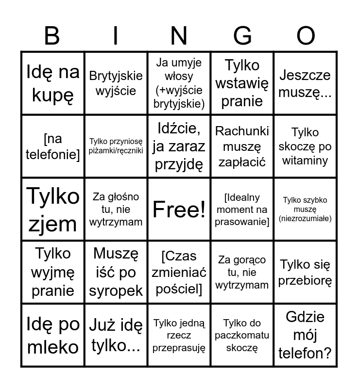 This bingo card has a free space and 24 words: Muszę iść po syropek, Już idę tylko..., Idźcie, ja zaraz przyjdę, Idę po mleko, Jeszcze muszę..., Idę na kupę, [na telefonie], Brytyjskie wyjście, [Idealny moment na prasowanie], [Czas zmieniać pościel], Rachunki muszę zapłacić, Tylko zjem, Za gorąco tu, nie wytrzymam, Tylko się przebiorę, Tylko przyniosę piżamki/ręczniki, Tylko do paczkomatu skoczę, Tylko szybko muszę (niezrozumiałe), Ja umyje włosy (+wyjście brytyjskie), Tylko skoczę po witaminy, Za głośno tu, nie wytrzymam, Gdzie mój telefon?, Tylko wyjmę pranie, Tylko wstawię pranie and Tylko jedną rzecz przeprasuję.