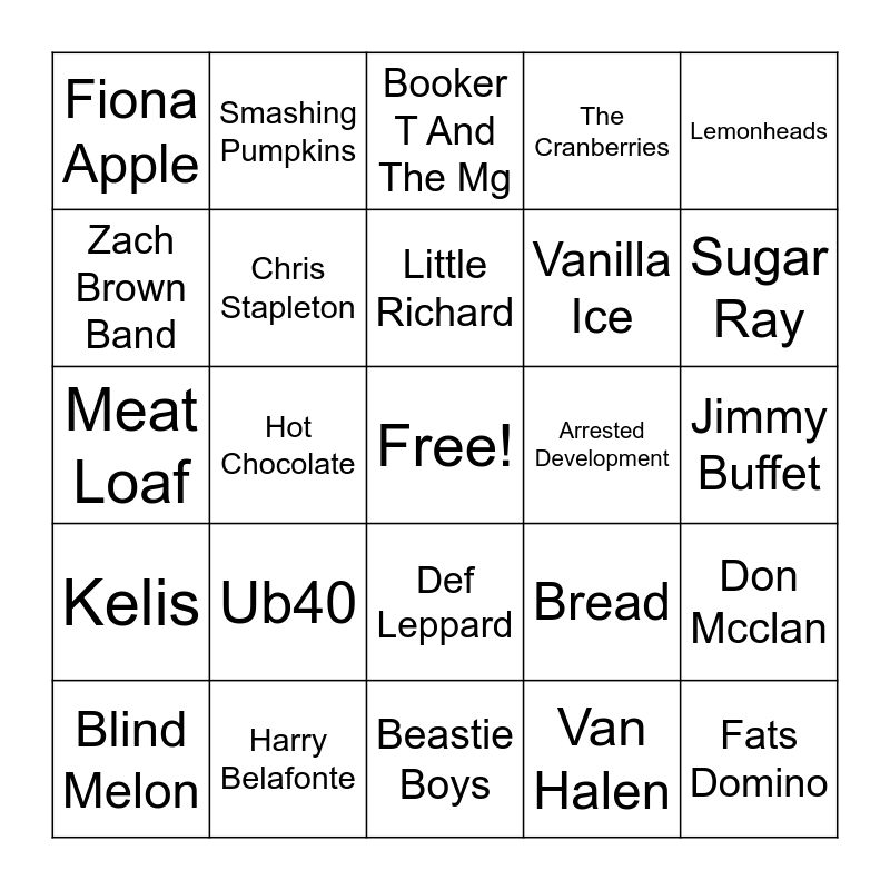 This bingo card has a free space and 72 words: Black Eyed Peas, Smashing Pumpkins, Hot Chocolate, Red Hot Chilli Peppers, Cream, Salt-N-Pepa, The Cranberries, Spice Girls, Vanilla Ice, Bowling For Soup, Blind Melon, Blue Oyster Cult, Sugar Ray, Fiona Apple, Bananarama, Meat Loaf, Bread, Lemonheads, Korn, Jimmy Buffet, Ub40, Fats Domino, Don Mcclan, Peter, Paul And Mary, Tribe Called Quest, Archie's, Rolling Stones, George Clinton, Snoop Dog, Beatles, Harry Belafonte, Bow Wow Wow, The Chordettes, Prince, Van Halen, Dnce, Cab Calloway, Cake, Zach Brown Band, 50 Cent, Def Leppard, Marvin Gaye, Rosemary Clooney, The Runaways, System Of A Down, Kelis, Rupert Holmes, Louis Prima, John Fogerty, Led Zeppelin, The Champs, Ella Fitzgerald, Il Cool J, Arrested Development, Jeff Buckley, The Supremes, Booker T And The Mg, Little Richard, B-52s, The Newbeats, Jack Black, James Brown, Zz Top, Beastie Boys, Rem, Lana Del Rey, Chris Stapleton, Deana Carter, Billy Joel, Marcy Playground, Fallout Boy and Jack Johnson.