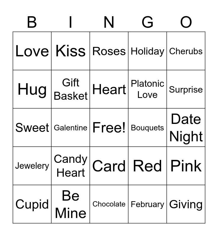 This bingo card has a free space and 25 words: Candy Heart, Chocolate, Heart, Cupid, Cherubs, Love, Hug, Kiss, Bouquets, Card, Platonic Love, Sweet, Red, Pink, Gift Basket, Balloons, Date Night, Roses, Surprise, Galentine, Giving, Be Mine, Jewelery, Holiday and February.