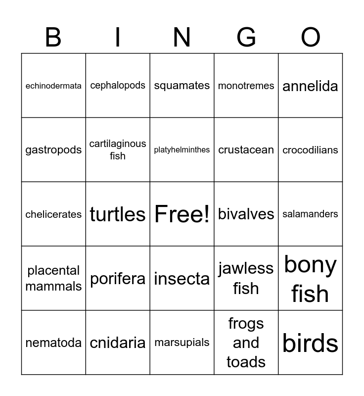 This bingo card has a free space and 24 words: porifera, cnidaria, platyhelminthes, nematoda, annelida, echinodermata, gastropods, cephalopods, bivalves, insecta, crustacean, chelicerates, jawless fish, bony fish, cartilaginous fish, frogs and toads, salamanders, squamates, crocodilians, turtles, birds, placental mammals, monotremes and marsupials.