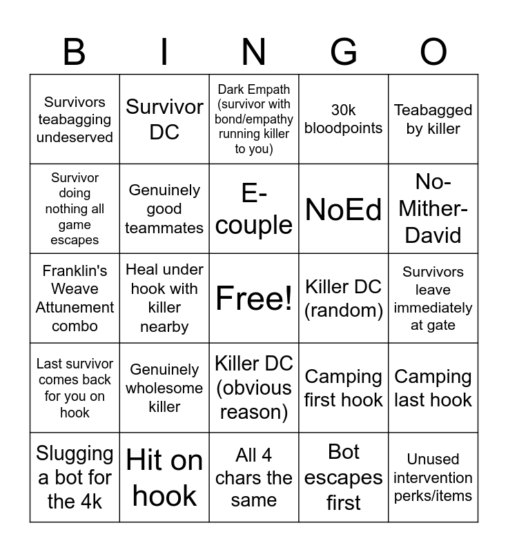 This bingo card has a free space and 24 words: Genuinely wholesome killer, Hit on hook, E-couple, Slugging a bot for the 4k, Teabagged by killer, Survivors teabagging undeserved, Survivor doing nothing all game escapes, Survivor DC, Killer DC (random), Killer DC (obvious reason), NoEd, Franklin's Weave Attunement combo, Camping first hook, Camping last hook, Genuinely good teammates, Bot escapes first, Survivors leave immediately at gate, Dark Empath (survivor with bond/empathy running killer to you), No-Mither-David, Heal under hook with killer nearby, Unused intervention perks/items, Last survivor comes back for you on hook, 30k bloodpoints and All 4 chars the same.