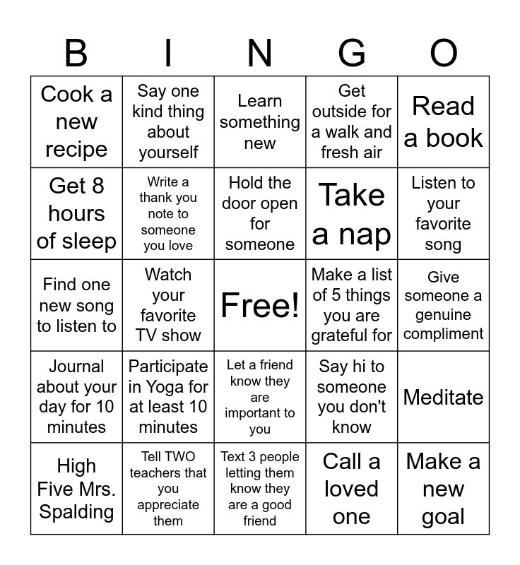 This bingo card has a free space and 24 words: Participate in Yoga for at least 10 minutes, Tell TWO teachers that you appreciate them, Hold the door open for someone, High Five Mrs. Spalding, Read a book, Cook a new recipe, Get 8 hours of sleep, Say one kind thing about yourself, Make a list of 5 things you are grateful for, Let a friend know they are important to you, Take a nap, Find one new song to listen to, Say hi to someone you don't know, Meditate, Write a thank you note to someone you love, Call a loved one, Give someone a genuine compliment, Learn something new, Listen to your favorite song, Watch your favorite TV show, Make a new goal, Journal about your day for 10 minutes, Get outside for a walk and fresh air and Text 3 people letting them know they are a good friend.