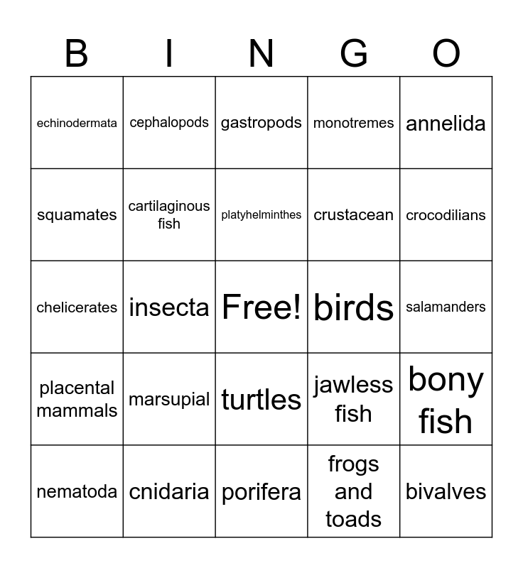 This bingo card has a free space and 24 words: marsupial, cnidaria, platyhelminthes, nematoda, annelida, echinodermata, squamates, cephalopods, birds, turtles, crustacean, chelicerates, jawless fish, bony fish, cartilaginous fish, frogs and toads, salamanders, gastropods, crocodilians, insecta, bivalves, placental mammals, monotremes and porifera.