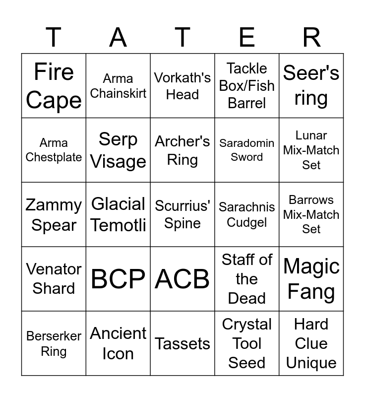 This bingo card has 25 words: BCP, Tassets, Archer's Ring, Berserker Ring, Seer's ring, Fire Cape, Arma Chestplate, Arma Chainskirt, Sarachnis Cudgel, ACB, Saradomin Sword, Zammy Spear, Staff of the Dead, Magic Fang, Serp Visage, Hard Clue Unique, Barrows Mix-Match Set, Vorkath's Head, Lunar Mix-Match Set, Glacial Temotli, Scurrius' Spine, Ancient Icon, Venator Shard, Tackle Box/Fish Barrel and Crystal Tool Seed.