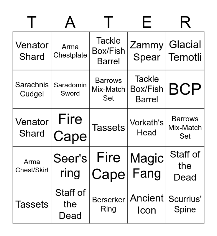 ⚠ This card has duplicate items: BCP (2), Tassets (2), Scurrius' Spine (2), Sarachnis Cudgel (2), ACB (2), Saradomin Sword (2), Zammy Spear (2), Staff of the Dead (2), Magic Fang (2), Serp Visage (2), Hard Clue Unique (2), Barrows Mix-Match Set (2), Vorkath's Head (2), Glacial Temotli (2), Fire Cape (2), Ancient Icon (2), Venator Shard (2), Tackle Box/Fish Barrel (2), Crystal Tool Seed (2)