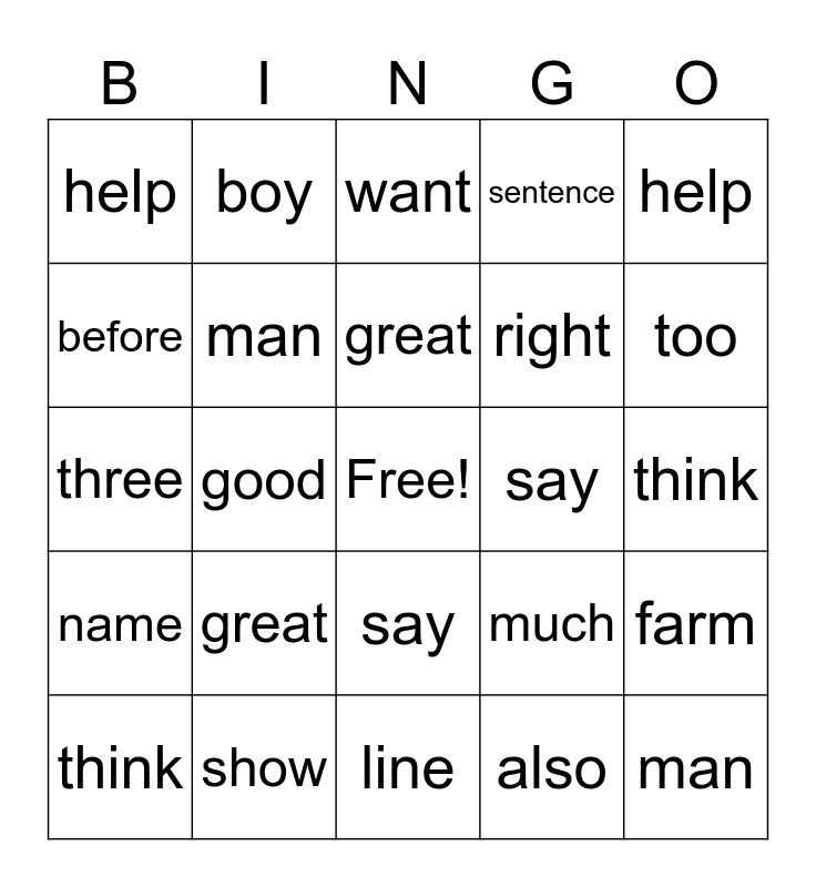 This bingo card has a free space and 39 words: name, good, sentence, man, think, say, great, where, help, name, good, sentence, man, think, say, great, where, help, through, much, before, line, right, too, means, old, any, same, tell, boy, following, came, want, show, also, around, farm, three and small.