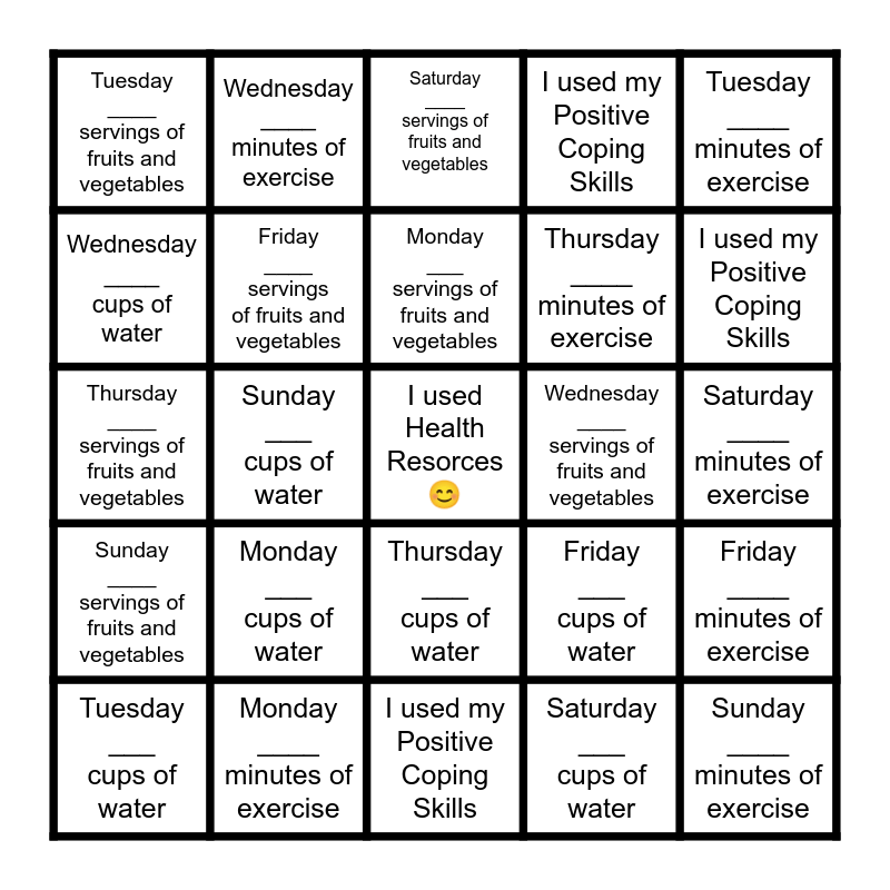 This bingo card has a free space and 24 words: Monday ___ cups of water, Monday ____ minutes of exercise, Monday ___ servings of fruits and vegetables, Tuesday ___ cups of water, Tuesday ____ minutes of exercise, Tuesday ____ servings of fruits and vegetables, Wednesday ____ cups of water, Wednesday ____ minutes of exercise, Wednesday ____ servings of fruits and vegetables, Thursday ___ cups of water, Thursday ____ minutes of exercise, Thursday ____ servings of fruits and vegetables, Friday ___ cups of water, Friday ____ minutes of exercise, Friday ____ servings of fruits and vegetables, Saturday ___ cups of water, Saturday ____ minutes of exercise, Saturday ____ servings of fruits and vegetables, I used my Positive Coping Skills, Sunday ___ cups of water, Sunday ____ minutes of exercise, Sunday ____ servings of fruits and vegetables, I used my Positive Coping Skills and I used my Positive Coping Skills.
