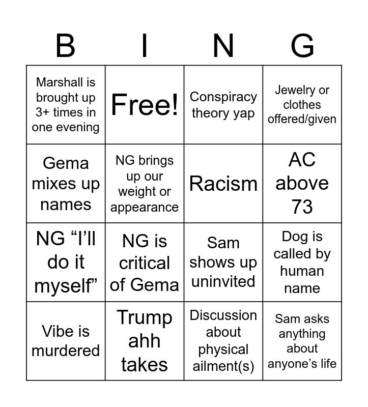 This bingo card has 19 words: Sam shows up uninvited, Sam yaps about gross whore gf, Conspiracy theory yap, Sam asks anything about anyone’s life, Dog is called by human name, Gema mixes up names, Discussion about physical ailment(s), Marshall is brought up 3+ times in one evening, Free!, NG “I’ll do it myself”, NG is critical of Gema, NG brings up our weight or appearance, Racism, Trump ahh takes, Vibe is murdered, Aunt Doris, Jewelry or clothes offered/given, AC above 73 and Asking Kate about marriage.