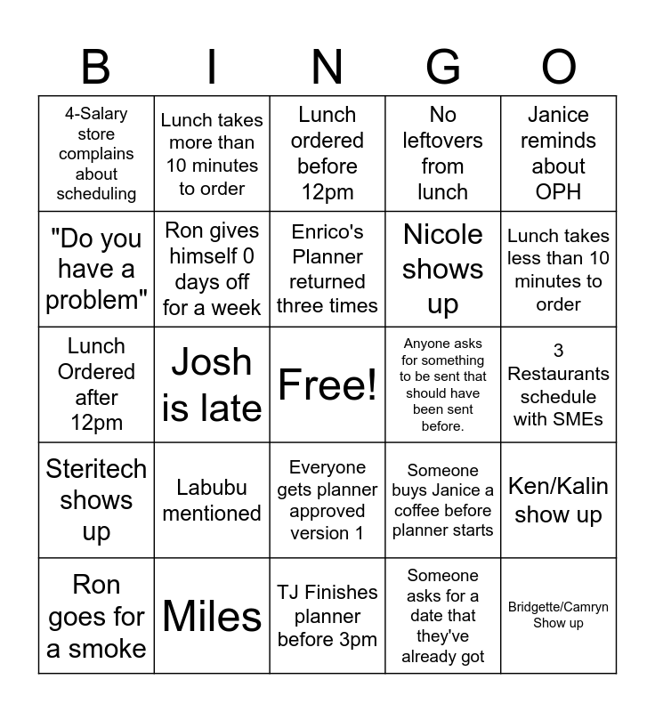 This bingo card has a free space and 24 words: Labubu mentioned, Miles, Enrico's Planner returned three times, Ron goes for a smoke, Janice reminds about OPH, 4-Salary store complains about scheduling, "Do you have a problem", Lunch takes more than 10 minutes to order, Anyone asks for something to be sent that should have been sent before., Everyone gets planner approved version 1, Nicole shows up, Lunch Ordered after 12pm, Someone buys Janice a coffee before planner starts, Ken/Kalin show up, Ron gives himself 0 days off for a week, Someone asks for a date that they've already got, 3 Restaurants schedule with SMEs, Lunch ordered before 12pm, Lunch takes less than 10 minutes to order, Josh is late, Bridgette/Camryn Show up, Steritech shows up, No leftovers from lunch and TJ Finishes planner before 3pm.