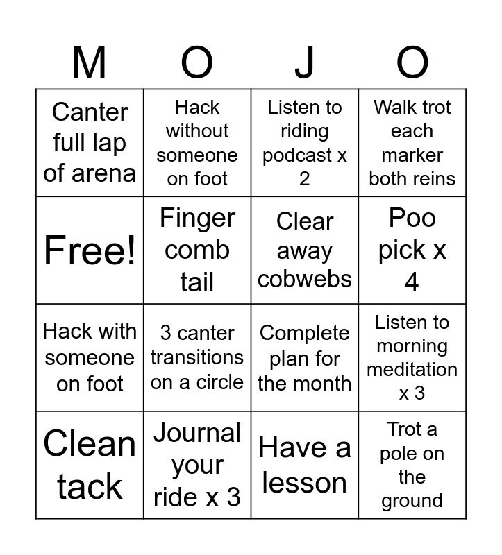 This bingo card has 16 words: Journal your ride x 3, Listen to morning meditation x 3, Listen to riding podcast x 2, Canter full lap of arena, Hack with someone on foot, Hack without someone on foot, Complete plan for the month, Have a lesson, Free!, Finger comb tail, Clean tack, Walk trot each marker both reins, 3 canter transitions on a circle, Poo pick x 4, Clear away cobwebs and Trot a pole on the ground.
