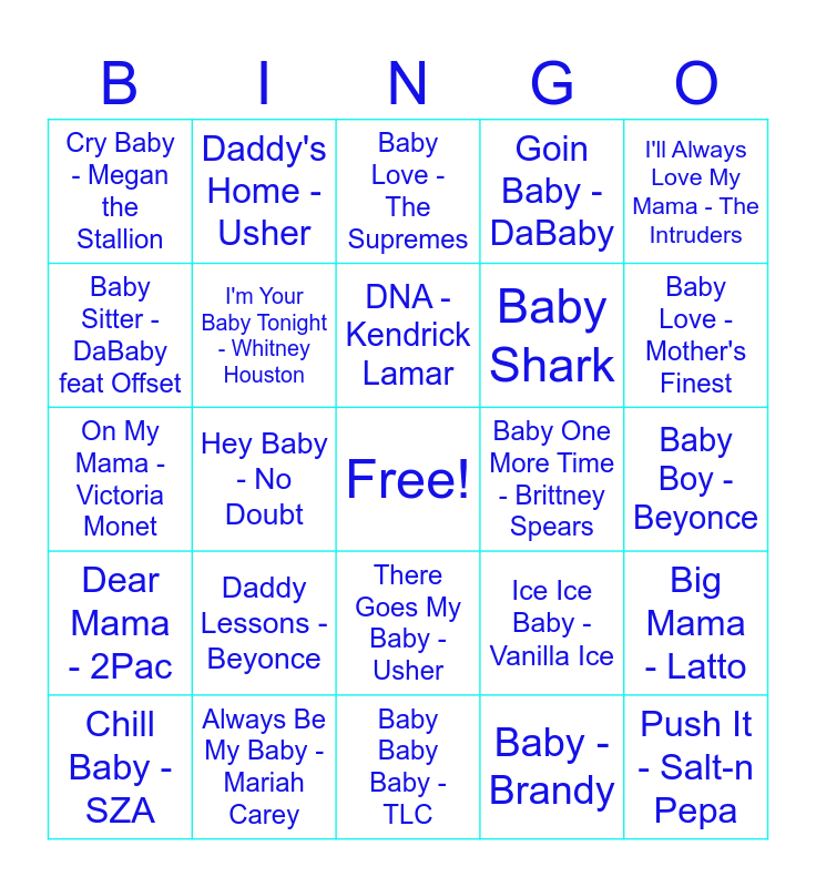 This bingo card has a free space and 30 words: Always Be My Baby - Mariah Carey, Baby - Ashanti, Hey Baby - No Doubt, Baby - Justin Bieber feat. Ludacris, Cry Baby - Megan the Stallion, Baby Love - The Supremes, I'm Your Baby Tonight - Whitney Houston, There Goes My Baby - Usher, Baby One More Time - Brittney Spears, Baby Baby Baby - TLC, Baby Boy - Beyonce, Push It - Salt-n Pepa, Baby - Brandy, Baby, I Love You - Aretha Franklin, Baby Love - Mother's Finest, Stuntin' Like My Daddy - Lil Wayne & Birdman, Ice Ice Baby - Vanilla Ice, Dear Mama - 2Pac, Daddy Lessons - Beyonce, I'll Always Love My Mama - The Intruders, On My Mama - Victoria Monet, Mama Used to Say - Junior, Daddy's Home - Usher, Baby Shark, Baby Sitter - DaBaby feat Offset, Goin Baby - DaBaby, Big Mama - Latto, Chill Baby - SZA, DNA - Kendrick Lamar and Childs Play - Drake.