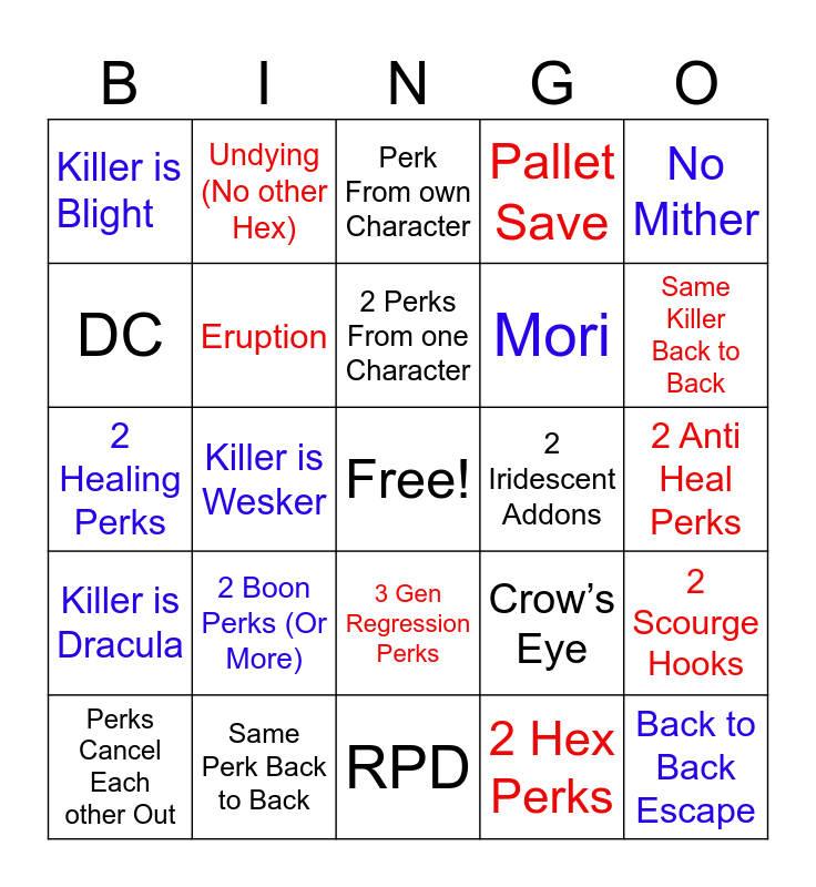 This bingo card has a free space and 24 words: 2 Boon Perks (Or More), Same Perk Back to Back, 2 Perks From one Character, Perks Cancel Each other Out, No Mither, Killer is Blight, DC, Undying (No other Hex), 2 Iridescent Addons, 3 Gen Regression Perks, Mori, 2 Healing Perks, Crow’s Eye, 2 Scourge Hooks, Eruption, 2 Hex Perks, 2 Anti Heal Perks, Perk From own Character, Same Killer Back to Back, Killer is Wesker, Back to Back Escape, Killer is Dracula, Pallet Save and RPD.