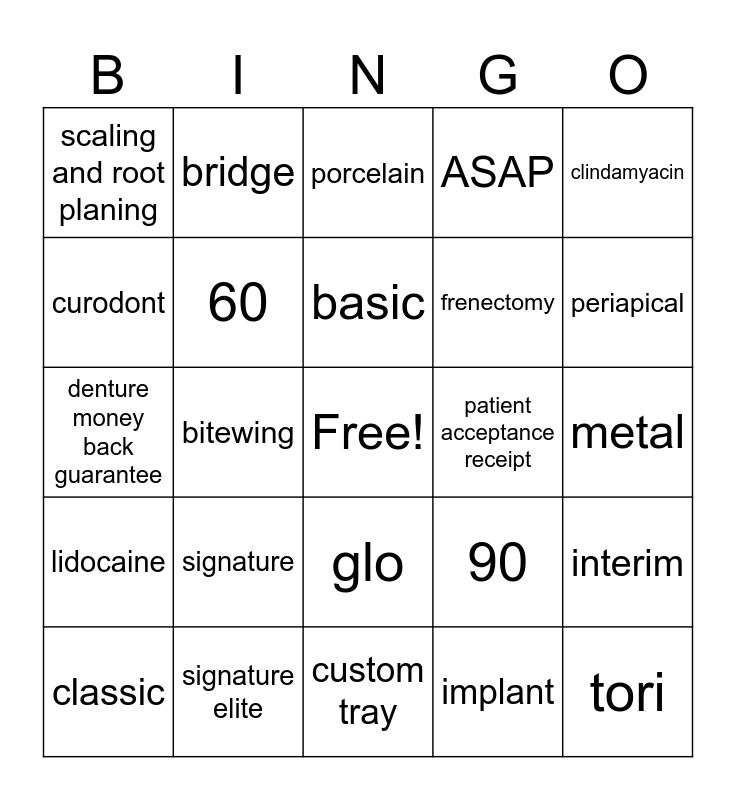 This bingo card has a free space and 24 words: signature, signature elite, basic, classic, clindamyacin, scaling and root planing, curodont, bridge, patient acceptance receipt, glo, frenectomy, denture money back guarantee, 90, interim, 60, implant, metal, porcelain, periapical, bitewing, tori, lidocaine, ASAP and custom tray.