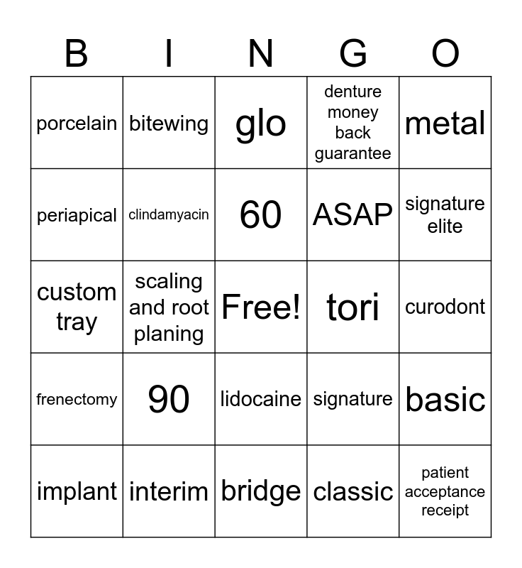 This bingo card has a free space and 24 words: 90, interim, 60, implant, metal, porcelain, periapical, bitewing, tori, lidocaine, ASAP, custom tray, signature, basic, clindamyacin, classic, curodont, glo, signature elite, scaling and root planing, patient acceptance receipt, frenectomy, denture money back guarantee and bridge.