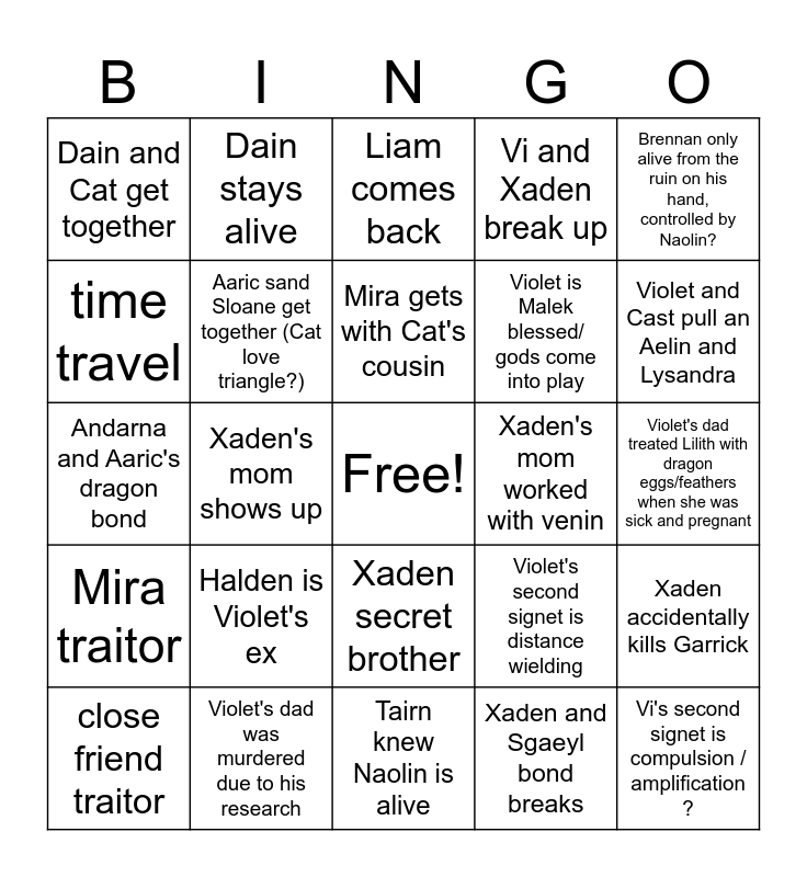 This bingo card has a free space and 24 words: Halden is Violet's ex, Violet's dad was murdered due to his research, Mira gets with Cat's cousin, close friend traitor, Brennan only alive from the ruin on his hand, controlled by Naolin?, Dain and Cat get together, time travel, Dain stays alive, Xaden's mom worked with venin, Xaden secret brother, Violet is Malek blessed/ gods come into play, Andarna and Aaric's dragon bond, Violet's second signet is distance wielding, Xaden accidentally kills Garrick, Aaric sand Sloane get together (Cat love triangle?), Xaden and Sgaeyl bond breaks, Violet's dad treated Lilith with dragon eggs/feathers when she was sick and pregnant, Liam comes back, Violet and Cast pull an Aelin and Lysandra, Xaden's mom shows up, Vi's second signet is compulsion / amplification ?, Mira traitor, Vi and Xaden break up and Tairn knew Naolin is alive.