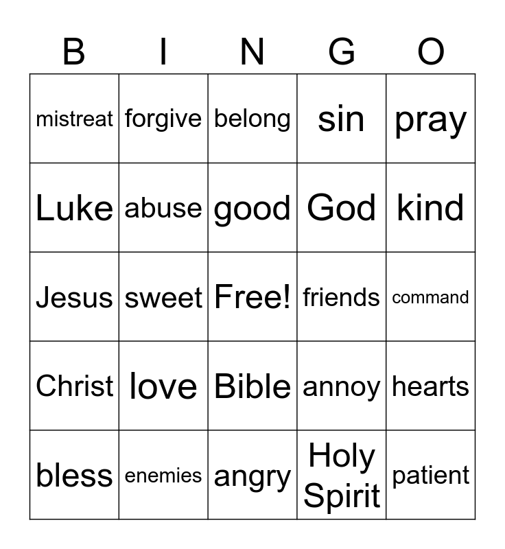 This bingo card has a free space and 24 words: love, enemies, good, bless, pray, mistreat, Luke, forgive, friends, Bible, God, Jesus, annoy, hearts, abuse, Holy Spirit, command, belong, kind, sweet, patient, Christ, sin and angry.