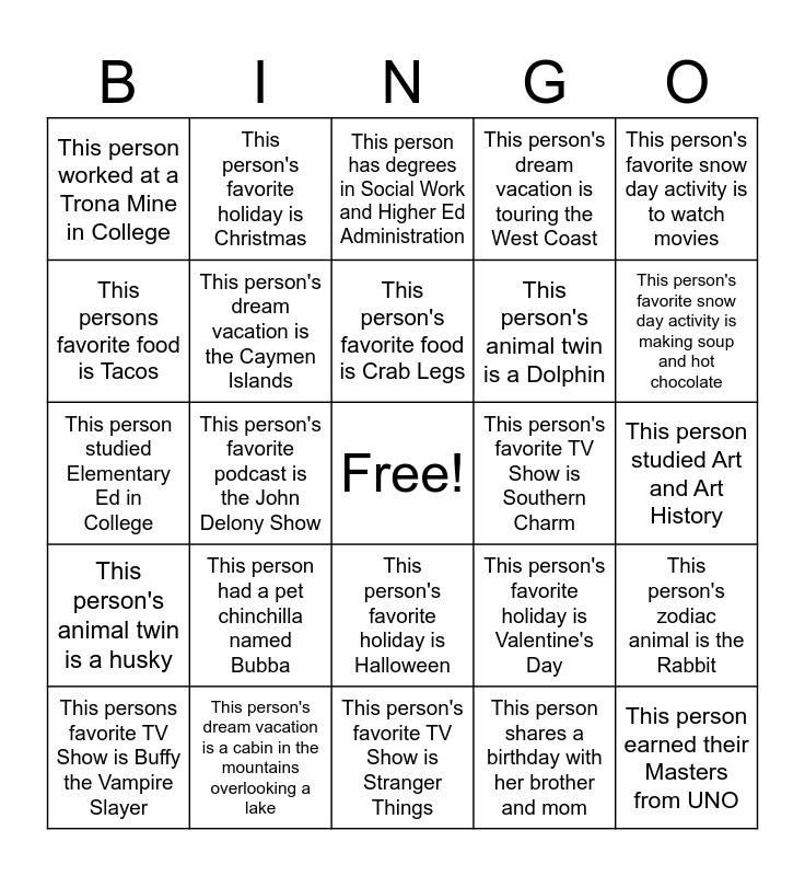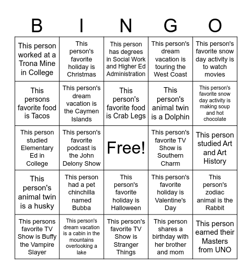 This bingo card has a free space and 24 words: This person had a pet chinchilla named Bubba, This person's dream vacation is a cabin in the mountains overlooking a lake, This person's favorite food is Crab Legs, This persons favorite TV Show is Buffy the Vampire Slayer, This person's favorite snow day activity is to watch movies, This person worked at a Trona Mine in College, This persons favorite food is Tacos, This person's favorite holiday is Christmas, This person's favorite TV Show is Southern Charm, This person's favorite holiday is Halloween, This person's animal twin is a Dolphin, This person studied Elementary Ed in College, This person's favorite holiday is Valentine's Day, This person's zodiac animal is the Rabbit, This person's dream vacation is the Caymen Islands, This person shares a birthday with her brother and mom, This person studied Art and Art History, This person has degrees in Social Work and Higher Ed Administration, This person's favorite snow day activity is making soup and hot chocolate, This person's favorite podcast is the John Delony Show, This person earned their Masters from UNO, This person's animal twin is a husky, This person's dream vacation is touring the West Coast and This person's favorite TV Show is Stranger Things.
