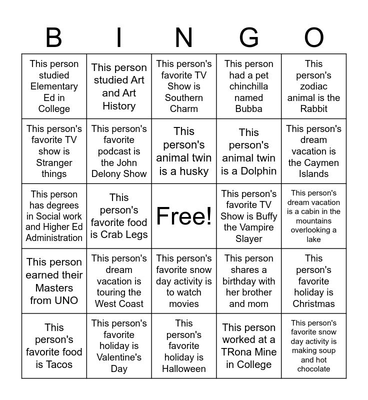 This bingo card has a free space and 24 words: This person's dream vacation is touring the West Coast, This person's favorite holiday is Valentine's Day, This person's animal twin is a husky, This person's favorite food is Tacos, This person's zodiac animal is the Rabbit, This person studied Elementary Ed in College, This person's favorite TV show is Stranger things, This person studied Art and Art History, This person's favorite TV Show is Buffy the Vampire Slayer, This person's favorite snow day activity is to watch movies, This person's animal twin is a Dolphin, This person has degrees in Social work and Higher Ed Administration, This person shares a birthday with her brother and mom, This person's favorite holiday is Christmas, This person's favorite podcast is the John Delony Show, This person worked at a TRona Mine in College, This person's dream vacation is a cabin in the mountains overlooking a lake, This person's favorite TV Show is Southern Charm, This person's dream vacation is the Caymen Islands, This person's favorite food is Crab Legs, This person's favorite snow day activity is making soup and hot chocolate, This person earned their Masters from UNO, This person had a pet chinchilla named Bubba and This person's favorite holiday is Halloween.