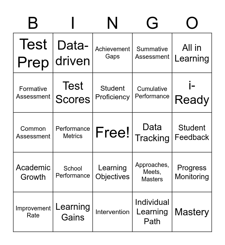 This bingo card has a free space and 35 words: Academic Achievement, Domain 1, Domain 2, Test Scores, Learning Objectives, Summative Assessment, Formative Assessment, Assessment Rubric, Student Proficiency, Performance Gap, Common Assessment, All in Learning, Benchmark, Student Engagement, Test Prep, Data Tracking, Individual Learning Path, Performance Metrics, Academic Growth, Mastery, Approaches, Meets, Masters, Improvement Rate, Progress Monitoring, Learning Gains, Achievement Gaps, i-Ready, Differentiated Instruction, Classroom Performance, Cumulative Performance, Student Feedback, Small Group, Intervention, School Performance, Data-driven and STAAR Aligned.