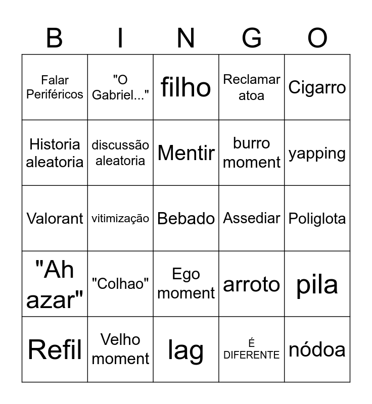This bingo card has a free space and 24 words: "Colhao", Velho moment, Mentir, Refil, Cigarro, Falar Periféricos, Historia aleatoria, "O Gabriel...", Assediar, Ego moment, burro moment, Valorant, arroto, pila, discussão aleatoria, É DIFERENTE, Poliglota, filho, yapping, vitimização, nódoa, "Ah azar", Reclamar atoa and lag.