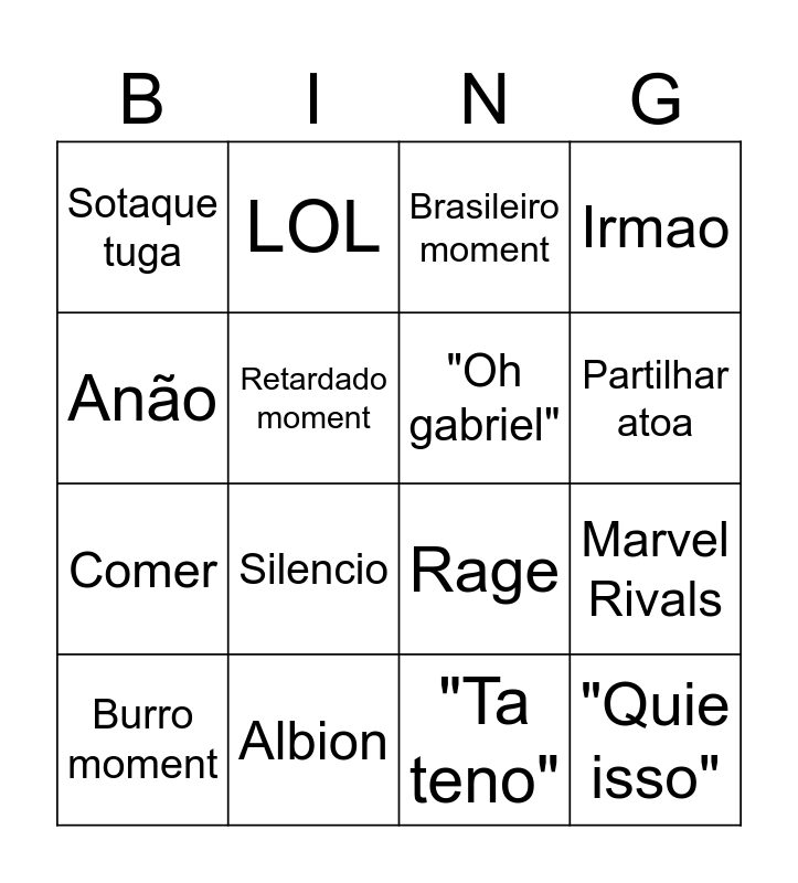 This bingo card has 16 words: Albion, Marvel Rivals, Brasileiro moment, Sotaque tuga, Comer, LOL, Rage, "Ta teno", Anão, Retardado moment, Burro moment, Irmao, Silencio, Partilhar atoa, "Oh gabriel" and "Quie isso".