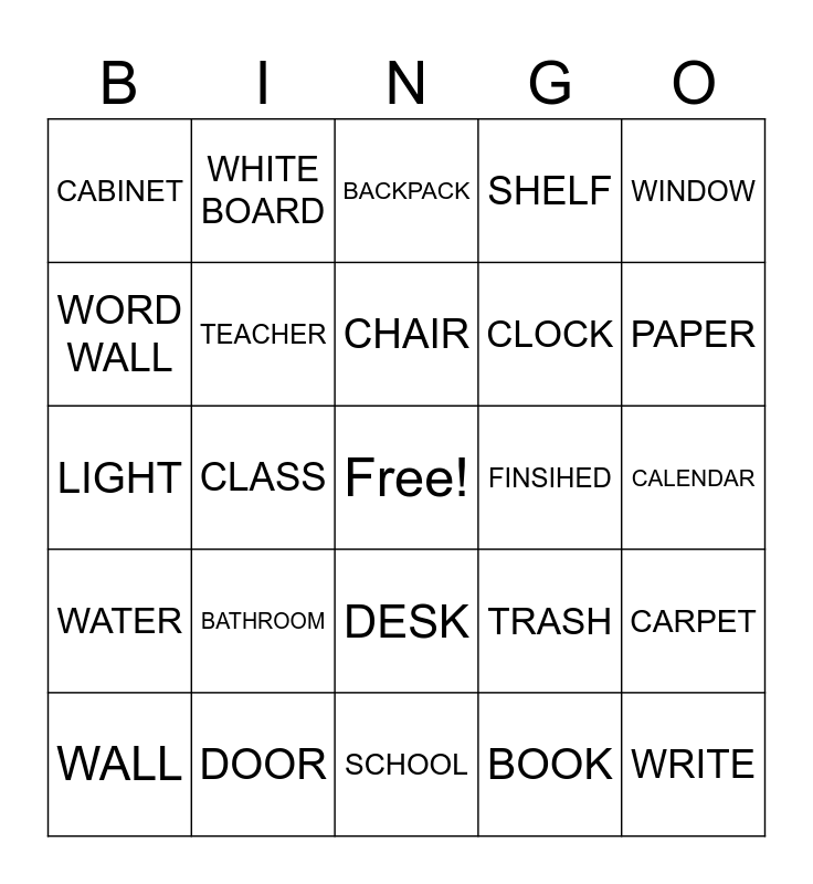 This bingo card has a free space and 26 words: DESK, BOOK, CHAIR, DOOR, WINDOW, CABINET, WORD WALL, WHITE BOARD, CALENDAR, TRASH, CLOCK, LIGHT, CARPET, WALL, CLASS, CLASSROOM, SHELF, WATER, BACKPACK, WRITE, PAPER, SCHOOL, FINSIHED, BATHROOM, TEACHER and STUDENT.