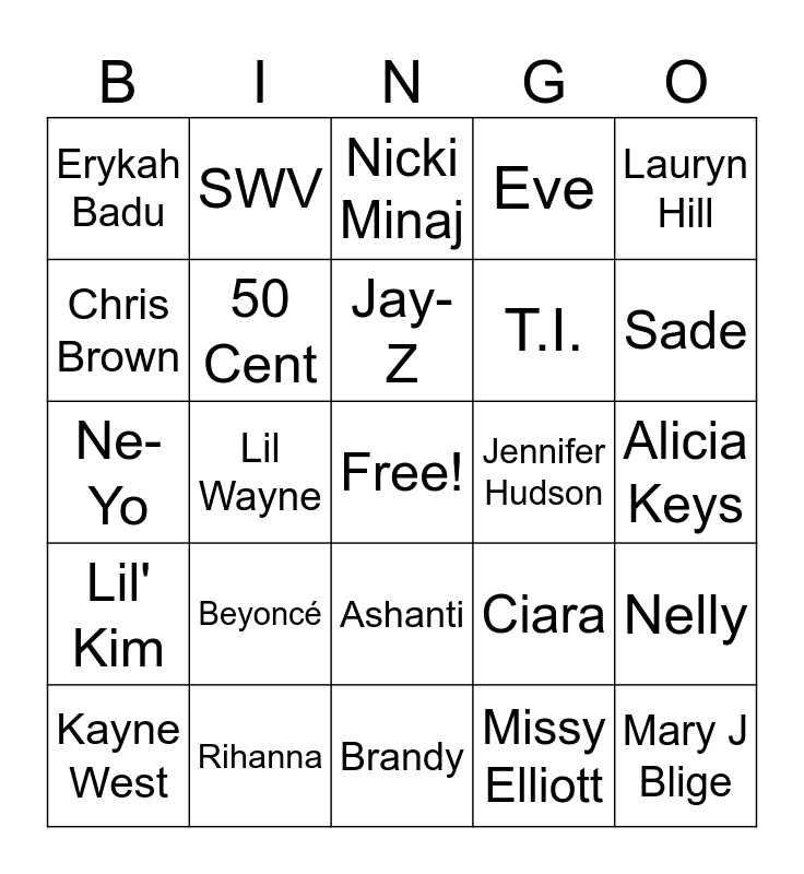 This bingo card has a free space and 24 words: Beyoncé, Rihanna, Jay-Z, Kayne West, Lauryn Hill, Erykah Badu, Chris Brown, SWV, Jennifer Hudson, Ashanti, T.I., Ne-Yo, Ciara, Nelly, 50 Cent, Missy Elliott, Alicia Keys, Nicki Minaj, Sade, Lil Wayne, Mary J Blige, Lil' Kim, Eve and Brandy.