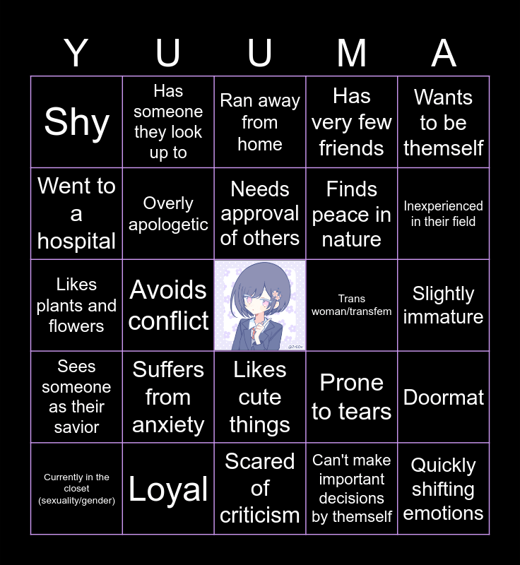 This bingo card has a free space and 24 words: Currently in the closet (sexuality/gender), Suffers from anxiety, Needs approval of others, Can't make important decisions by themself, Wants to be themself, Shy, Has someone they look up to, Ran away from home, Trans woman/transfem, Slightly immature, Likes plants and flowers, Overly apologetic, Prone to tears, Doormat, Went to a hospital, Loyal, Scared of criticism, Has very few friends, Inexperienced in their field, Sees someone as their savior, Avoids conflict, Likes cute things, Finds peace in nature and Quickly shifting emotions.