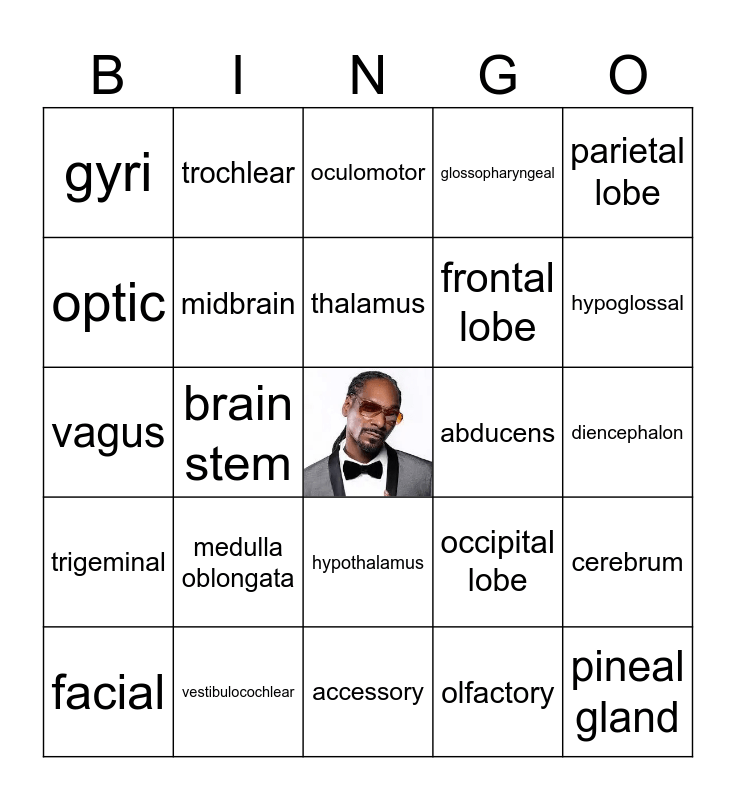This bingo card has a free space and 28 words: cerebrum, cerebellum, frontal lobe, olfactory, optic, oculomotor, trochlear, trigeminal, abducens, facial, vagus, glossopharyngeal, vestibulocochlear, accessory, hypoglossal, pons, medulla oblongata, midbrain, thalamus, hypothalamus, gyri, sulci, pineal gland, brain stem, diencephalon, occipital lobe, parietal lobe and temporal lobe.