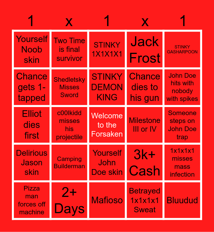 This bingo card has a free space and 34 words: Guest User that does NOTHING, Betrayed 1x1x1x1 Sweat, Projectile forces off machine, Female Shedletsky, Delirious Jason skin, Shedletsky Misses Sword, STINKY GASHARPOON, Pizza man forces off machine, Two Time is final survivor, Camping Two Time, STINKY DEMON KING, STINKY 1X1X1X1, Someone uses Two Time, Camping Noob, Milestone III or IV, John Doe hits with nobody with spikes, 2+ Days, Elliot dies first, Camping Builderman, 3k+ Cash, Yourself John Doe skin, SO RETRO, Yourself Noob skin, Someone steps on John Doe trap, Mafioso, Bluudud, Jack Frost, Santa John Doe, Chance dies to his gun, Chance gets 1-tapped, c00lkidd misses his dash, c00lkidd misses his projectile, 1x1x1x1 misses mass infection and 1x1x1x1 misses entanglement.