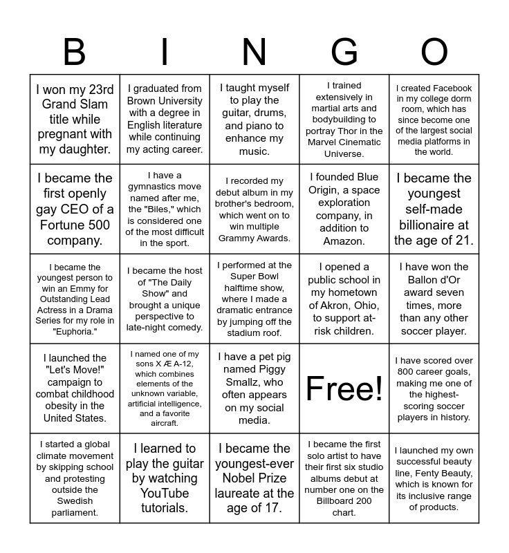 This bingo card has 25 words: I named one of my sons X Æ A-12, which combines elements of the unknown variable, artificial intelligence, and a favorite aircraft., I became the youngest-ever Nobel Prize laureate at the age of 17., I recorded my debut album in my brother's bedroom, which went on to win multiple Grammy Awards., I started a global climate movement by skipping school and protesting outside the Swedish parliament., I created Facebook in my college dorm room, which has since become one of the largest social media platforms in the world., I won my 23rd Grand Slam title while pregnant with my daughter., I became the first openly gay CEO of a Fortune 500 company., I graduated from Brown University with a degree in English literature while continuing my acting career., I opened a public school in my hometown of Akron, Ohio, to support at-risk children., I have a pet pig named Piggy Smallz, who often appears on my social media., I founded Blue Origin, a space exploration company, in addition to Amazon., I became the youngest person to win an Emmy for Outstanding Lead Actress in a Drama Series for my role in "Euphoria.", Free!, I have scored over 800 career goals, making me one of the highest-scoring soccer players in history., I have a gymnastics move named after me, the "Biles," which is considered one of the most difficult in the sport., I launched my own successful beauty line, Fenty Beauty, which is known for its inclusive range of products., I have won the Ballon d'Or award seven times, more than any other soccer player., I taught myself to play the guitar, drums, and piano to enhance my music., I became the youngest self-made billionaire at the age of 21., I became the host of "The Daily Show" and brought a unique perspective to late-night comedy., I performed at the Super Bowl halftime show, where I made a dramatic entrance by jumping off the stadium roof., I learned to play the guitar by watching YouTube tutorials., I launched the "Let's Move!" campaign to combat childhood obesity in the United States., I trained extensively in martial arts and bodybuilding to portray Thor in the Marvel Cinematic Universe. and I became the first solo artist to have their first six studio albums debut at number one on the Billboard 200 chart..