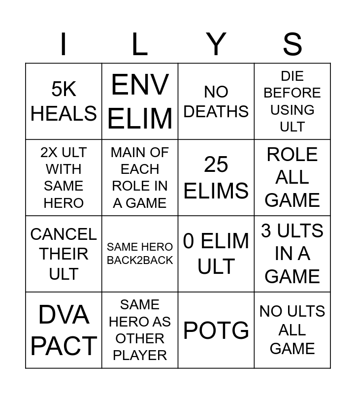 This bingo card has 17 words: POTG, DVA PACT, NO DEATHS, 5K HEALS, SAME HERO BACK2BACK, DIE BEFORE USING ULT, 3 ULTS IN A GAME, 25 ELIMS, ROLE ALL GAME, MAIN OF EACH ROLE IN A GAME, SAME HERO AS OTHER PLAYER, 0 ELIM ULT, 2X ULT WITH SAME HERO, ENV ELIM, CANCEL THEIR ULT, NO ULTS ALL GAME and NO ULTS ALL GAME.