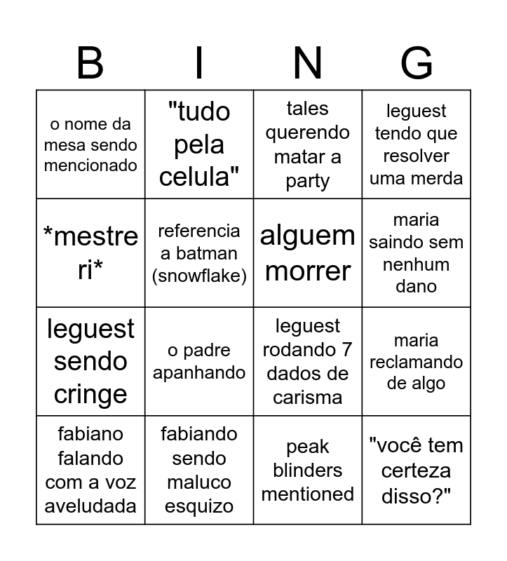 This bingo card has 16 words: fabiando sendo maluco esquizo, maria reclamando de algo, tales querendo matar a party, o nome da mesa sendo mencionado, leguest sendo cringe, "tudo pela celula", leguest rodando 7 dados de carisma, peak blinders mentioned, *mestre ri*, referencia a batman (snowflake), fabiano falando com a voz aveludada, leguest tendo que resolver uma merda, o padre apanhando, maria saindo sem nenhum dano, alguem morrer and "você tem certeza disso?".
