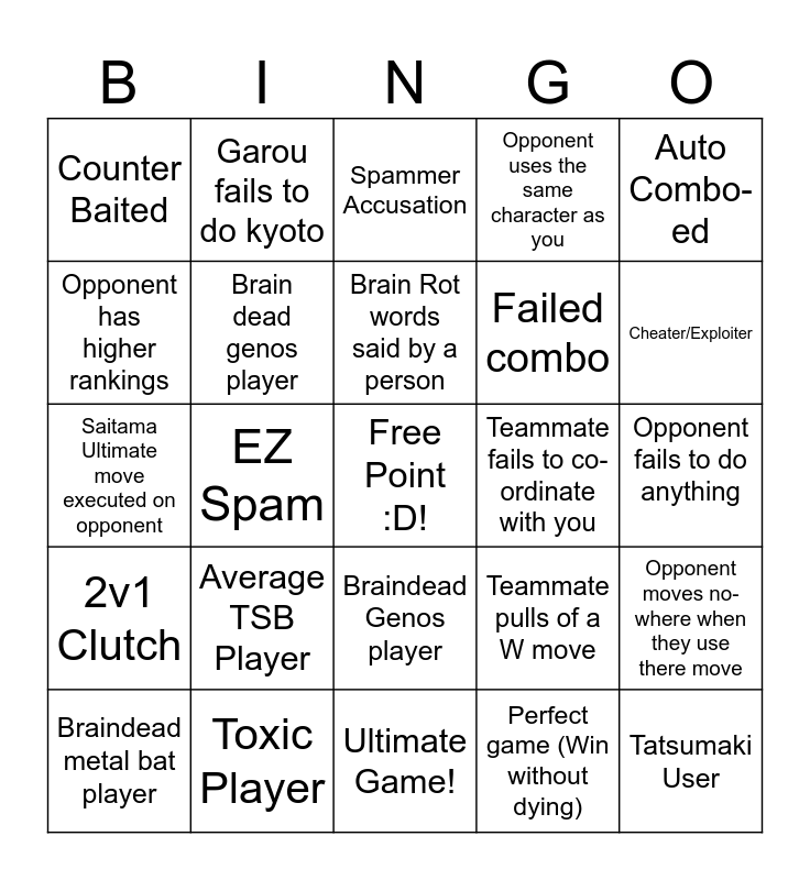 This bingo card has a free space and 24 words: Average TSB Player, Toxic Player, Brain Rot words said by a person, Braindead metal bat player, Auto Combo-ed, Counter Baited, Opponent has higher rankings, Garou fails to do kyoto, Teammate fails to co-ordinate with you, Braindead Genos player, Failed combo, Saitama Ultimate move executed on opponent, Teammate pulls of a W move, Opponent moves no-where when they use there move, Brain dead genos player, Perfect game (Win without dying), Opponent fails to do anything, Spammer Accusation, Cheater/Exploiter, EZ Spam, Tatsumaki User, 2v1 Clutch, Opponent uses the same character as you and Ultimate Game!.