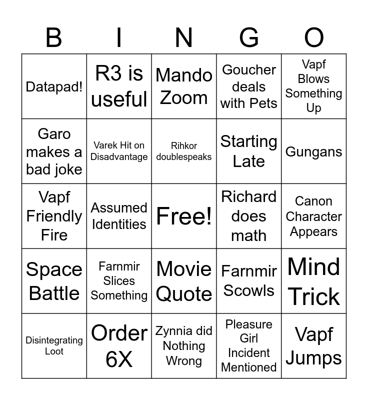 This bingo card has a free space and 27 words: Farnmir Scowls, Blind Jokes, Starting Late, Zynnia did Nothing Wrong, Garo makes a bad joke, Mando Zoom, R3 is useful, Space Battle, Richard does math, Mind Trick, Vapf Friendly Fire, Goucher deals with Pets, Disintegrating Loot, Order 6X, Gungans, Lightsaber Duel, Varek Hit on Disadvantage, Rihkor doublespeaks, Farnmir Slices Something, Datapad!, Canon Character Appears, Pleasure Girl Incident Mentioned, Assumed Identities, Vapf Jumps, Movie Quote, Vapf Blows Something Up and MAKASHI REPOSTE.
