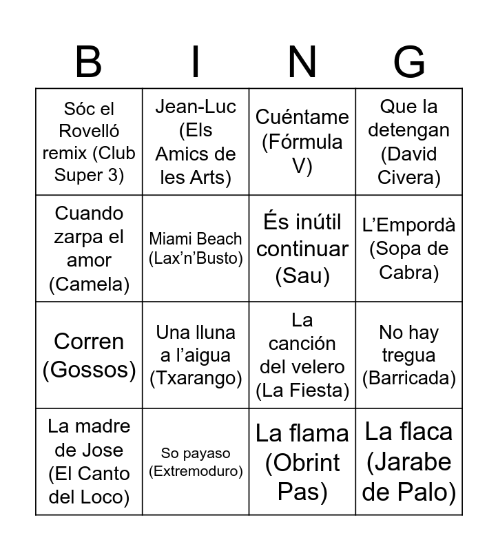 This bingo card has 92 words: BINGO, 10+2 (Club Super 3), Al amanecer (Los Fresones Rebeldes), Alegria (Antònia Font), Amigos para siempre (Los Manolos), Aquí no hay playa (The Refrescos), Benvolgut (Manel), Bohemian Rhapsody (Queen), Bon dia (Els Pets), Bonito (Jarabe de Palo), Camals Mullats (La Gossa Sorda), Camins (Sopa de Cabra), Como Camarón (Estopa), Corren (Gossos), Cuando tú vas (Chenoa), Cuando zarpa el amor (Camela), Cuéntame (Fórmula V), Désenchantée (Kate Ryan), Dime (Beth), Don’t speak (Zombie), El burrito sabanero (David Bisbal), El Puente (Los Mismos), El vestir d’en Pasqual (Núria Feliu), El vol de l’home ocell (Sangtraït), Ellos dicen mierda (La Polla Records), És inútil continuar (Sau), És superfort (Josmar), Esbarzers – remix (ZOO i La Gossa Sorda), Everytime we touch (Cascada), Fiesta pagana (Mägo de Oz), Fly on the wings of love (XTM Annia i Eva Marti), Flying free (Pont Aeri), Gimme! Gimme! Gimme! (ABBA), Himne dels pirates (Dagoll Dagom), Jean-Luc (Els Amics de les Arts), Jenifer (Els Catarres), Jo vull ser rei (Els Pets), L’amour toujours (Gigi d’Agostino), L’Empordà (Sopa de Cabra), La bilirrubina (Juan Luís Guerra), La canción del velero (La Fiesta), La flaca (Jarabe de Palo), La flama (Obrint Pas), La gent que estimo (Oques Grasses i Rita Payés), La madre de Jose (El Canto del Loco), La Marina sta morena (Figa Flawas), La playa (La Oreja de Van Gogh), La revolución sexual (La Casa Azul), Les nits no moren mai (Doctor Prats), Llum foc destrucció (Bola de Drac; Club Super 3), Mambo N.5 (Lou Bega), Mari Carmen (La Pegatina), María Caipirinha (Carlinhos Brown i DJ Dero), Marta Sebas Guille y los demàs (Amaral), Me gustas tú (Manu Chao), Me voy de fiesta (Tss Proyect i Irantzu), Més que la meva sang (Lax’n’Busto), Miami Beach (Lax’n’Busto), Mierda de Ciudad (Kortatu), No hay tregua (Barricada), No rompas mi corazón (Coyote Dax), Olívia (The Tyets), One step beyond (Madness), Per una copa (Lax’n’Busto), Petit rumbero (La Troba Kung-Fú), Plan 10 (Dr. Calypso), Pop (La Oreja de Van Gogh), Por la raja de tu falsa (Estopa), Puc ser jo (Whiskyn’s), Puedes contar conmigo (María Escarmiento BLNCO i, detunedfreq), Quan somrius (Col·lectiva), Que la detengan (David Civera), Que te den (Amparanoia), Que tinguem sort (Wildside), Qui s’enganxa a la rodanxa (Club Super 3), Quina calitja (La Gossa Sorda), Rosas remix (La Oreja de Van Gogh; Napy), Sarandonga (Lolita), Sarri sarri (Kortatu), Saturday night (Whigfield), So payaso (Extremoduro), Sóc el Rovelló remix (Club Super 3), Sólo vivir (Skalariak), Sonajeros (Dusminguet), Super fashion (Macedònia), Te quiero más (Fórmula Abierta), Tobogan (ZOO), Toma vitamina (La Fiesta), Tu jardín con enanitos (Melendi), Una lluna a l’aigua (Txarango) and Y yo sigo aquí (Paulina Rubio).