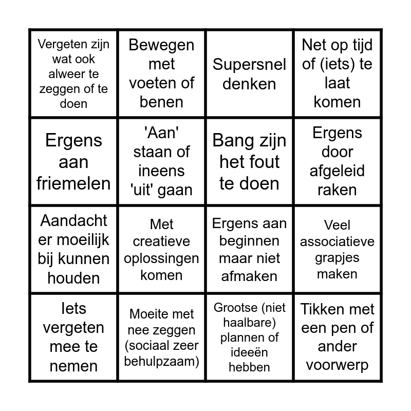 This bingo card has 16 words: Moeite met nee zeggen (sociaal zeer behulpzaam), Veel associatieve grapjes maken, Supersnel denken, Vergeten zijn wat ook alweer te zeggen of te doen, Aandacht er moeilijk bij kunnen houden, Bewegen met voeten of benen, Ergens aan beginnen maar niet afmaken, Grootse (niet haalbare) plannen of ideeën hebben, Ergens aan friemelen, 'Aan' staan of ineens 'uit' gaan, Iets vergeten mee te nemen, Net op tijd of (iets) te laat komen, Met creatieve oplossingen komen, Ergens door afgeleid raken, Bang zijn het fout te doen and Tikken met een pen of ander voorwerp.