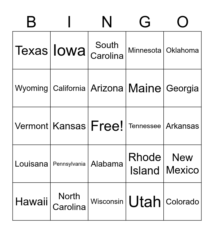 This bingo card has a free space and 24 words: Pennsylvania, North Carolina, Arizona, Hawaii, Oklahoma, Texas, Wyoming, Iowa, Tennessee, Alabama, Maine, Vermont, Rhode Island, New Mexico, California, Utah, Arkansas, South Carolina, Georgia, Kansas, Colorado, Louisana, Minnesota and Wisconsin.