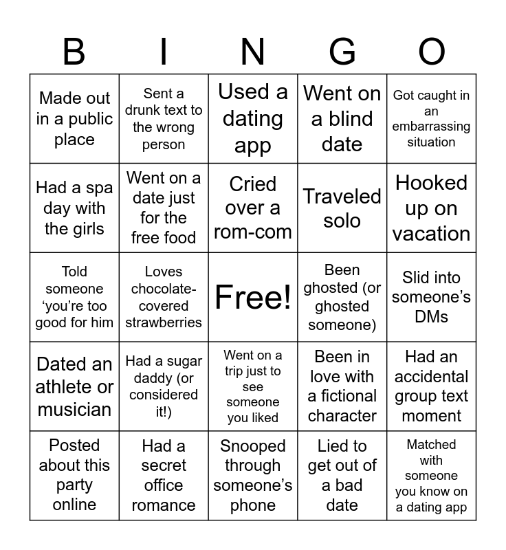 This bingo card has a free space and 29 words: Posted about this party online, Took a cute selfie tonight, Loves chocolate-covered strawberries, Said ‘cheers’ tonight, Made out in a public place, Used a dating app, Went on a date just for the free food, Had a sugar daddy (or considered it!), Been ghosted (or ghosted someone), Had a secret office romance, Slid into someone’s DMs, Matched with someone you know on a dating app, Snooped through someone’s phone, Lied to get out of a bad date, Hooked up on vacation, Got kicked out of a club, Went on a trip just to see someone you liked, Dated an athlete or musician, Got caught in an embarrassing situation, Told someone ‘you’re too good for him, Been in love with a fictional character, Considered being a cougar, Traveled solo, Had a spa day with the girls, Went on a blind date, Sent a drunk text to the wrong person, Had an accidental group text moment, Cried over a rom-com and Done something exciting in a moving vehicle or transportation?.