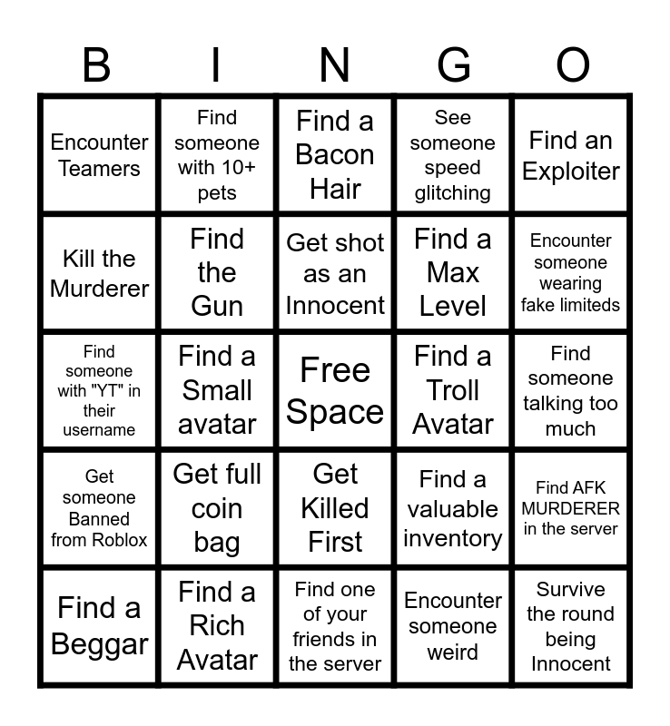 This bingo card has a free space and 24 words: Get full coin bag, Find a Rich Avatar, Get shot as an Innocent, Find a Beggar, Find an Exploiter, Encounter Teamers, Kill the Murderer, Find someone with 10+ pets, Find a Troll Avatar, Get Killed First, Find a Max Level, Find someone with "YT" in their username, Find a valuable inventory, Find AFK MURDERER in the server, Find the Gun, Encounter someone weird, Find someone talking too much, Find a Bacon Hair, Encounter someone wearing fake limiteds, Find a Small avatar, Survive the round being Innocent, Get someone Banned from Roblox, See someone speed glitching and Find one of your friends in the server.