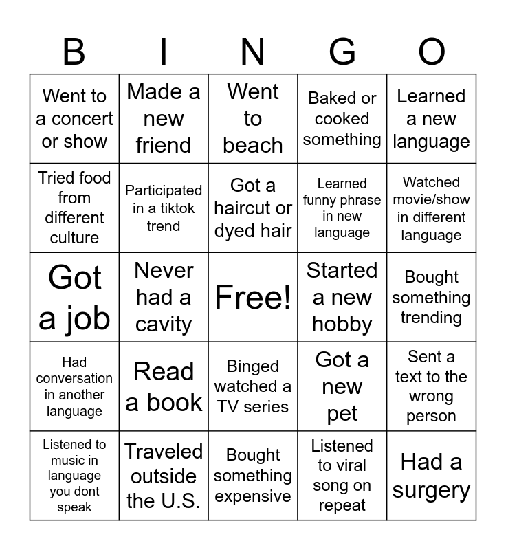 This bingo card has a free space and 24 words: Read a book, Traveled outside the U.S., Got a haircut or dyed hair, Listened to music in language you dont speak, Learned a new language, Went to a concert or show, Tried food from different culture, Made a new friend, Started a new hobby, Binged watched a TV series, Learned funny phrase in new language, Got a job, Got a new pet, Sent a text to the wrong person, Participated in a tiktok trend, Listened to viral song on repeat, Bought something trending, Went to beach, Watched movie/show in different language, Never had a cavity, Had a surgery, Had conversation in another language, Baked or cooked something and Bought something expensive.