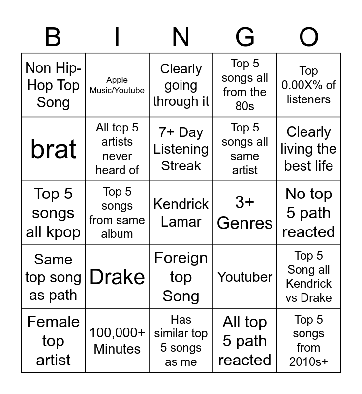 This bingo card has a free space and 24 words: Drake, 100,000+ Minutes, 7+ Day Listening Streak, Female top artist, Top 0.00X% of listeners, Non Hip-Hop Top Song, brat, Apple Music/Youtube, 3+ Genres, Foreign top Song, Top 5 songs all same artist, Top 5 songs all kpop, Youtuber, Top 5 Song all Kendrick vs Drake, All top 5 artists never heard of, All top 5 path reacted, No top 5 path reacted, Clearly going through it, Clearly living the best life, Top 5 songs from same album, Top 5 songs from 2010s+, Same top song as path, Top 5 songs all from the 80s and Has similar top 5 songs as me.